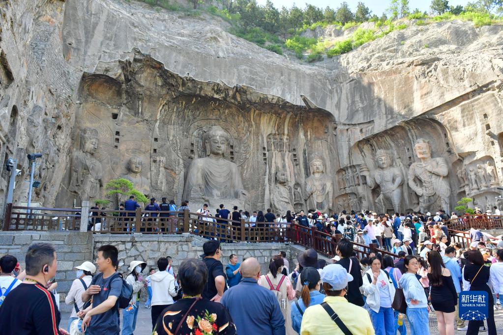 4月29日,游客在河南洛阳龙门石窟景区游览。