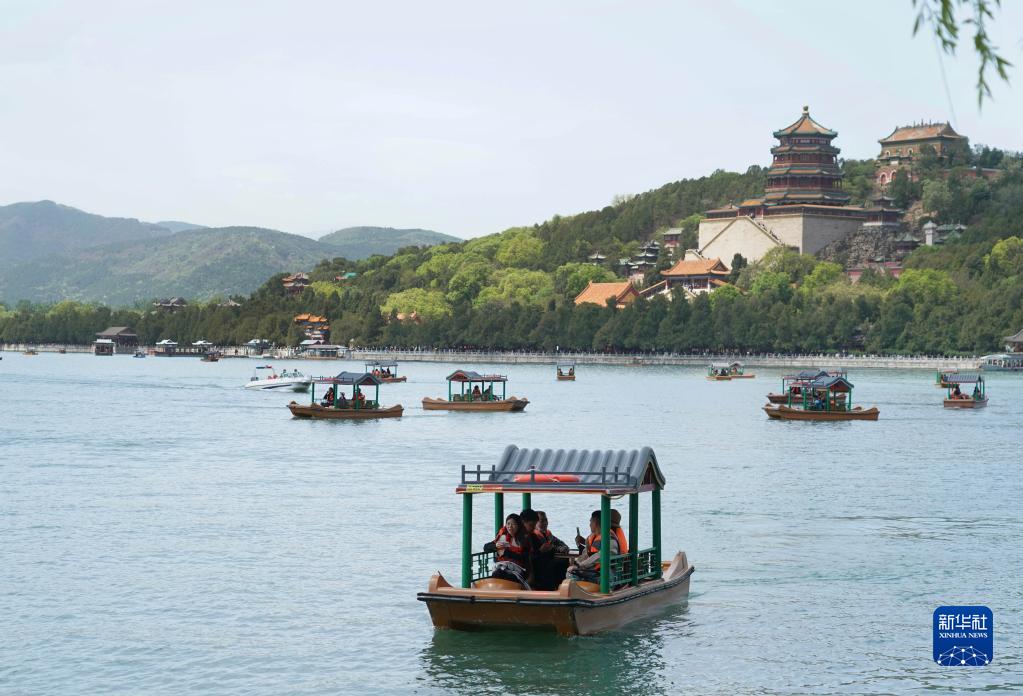 4月29日,游客在北京颐和园乘船游玩。