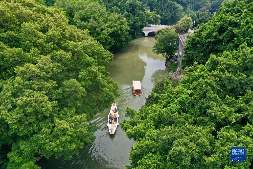 4月29日,游客乘坐游船游览福州白马河(无人机照片)。
