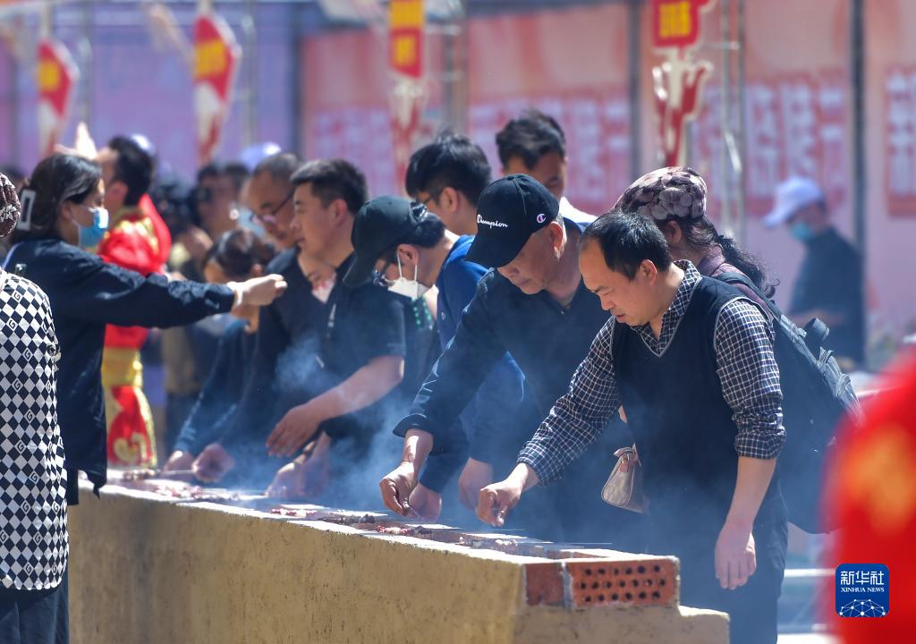 4月29日,在新疆国际大巴扎烧烤体验区,游客在体验自助烧烤。