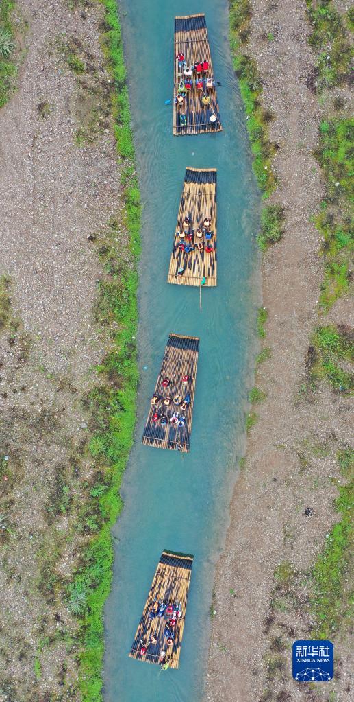 4月29日,游客在浙江省台州市仙居县永安溪体验生态竹筏漂流(无人机照片)。