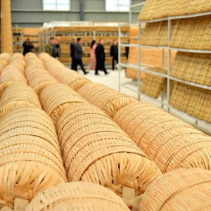 4月29日,消费者在湖北省宣恩县一家黑茶企业的黑茶晾晒场参观。