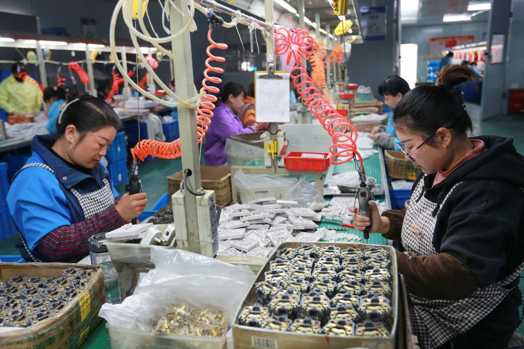 3月28日,在淮北市杜集区石台镇农民工创业园,一家开关生产企业的工人在车间内忙碌。新华社发(万善朝 摄)