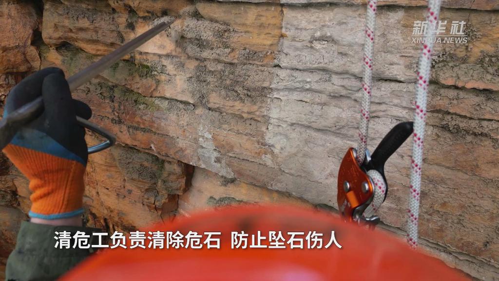 在山西省黎城县黄崖洞文化旅游区,有一对被称为“崖壁清危工”的师徒档,每年“五一”等节假日来临前,他们都要对山体进行检查、清理,在数百米高的悬崖峭壁间“行走”,挥动手中的钢钎,排除风化松动的危石,防止坠石伤人,守护景区游客的安全。