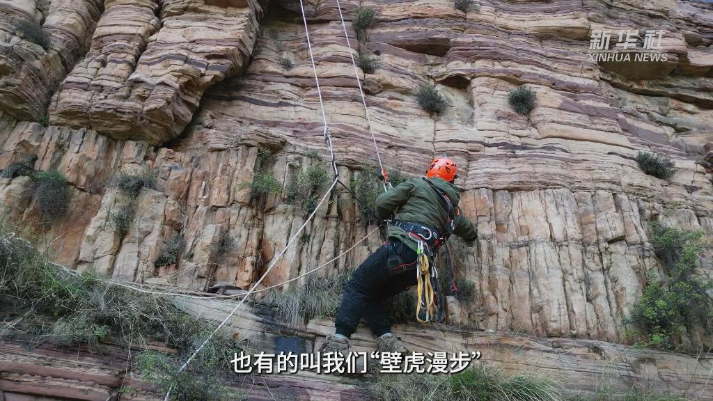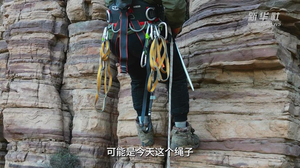 安全保障是两人最关注的事,每次下吊前,他们总是要反复确认安全带和安全绳是否系紧,降速器等装备是否正常。一人下吊作业,另一人在山顶看护辅助,两人通过对讲机进行交流,默契配合。