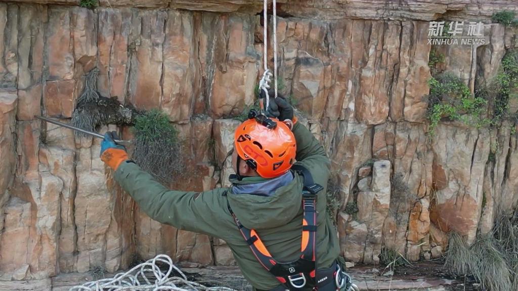 每次清危,都是一次真正意义上的攀岩运动,他们需要先用镰刀扒开杂草,扛着绳索和沉重的装备,艰难地从陡峭蜿蜒的山坡登上山顶,较远的高崖光是爬上山顶就需要两个多小时。登顶后,再从几百米高的悬崖上把人吊放下来,悬在毫无依靠的半空中,然后在岩壁上攀爬、挪移,排除松动的石块。