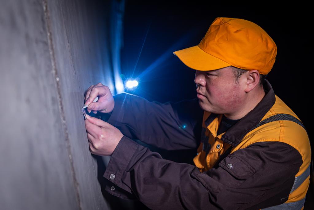 唐佳测量隧道墙壁裂纹大小。新华社发(闻子豪 摄)