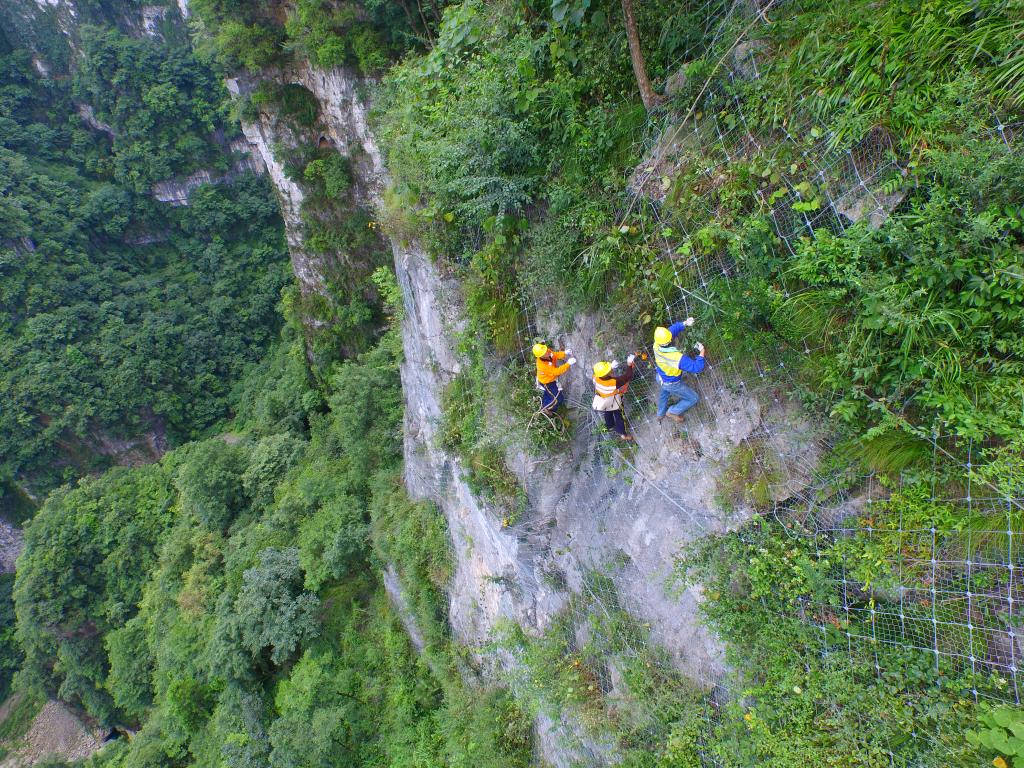 鲁朝忠(右一)和工友攀爬岩壁巡查危石。新华社发(彭琦 摄)