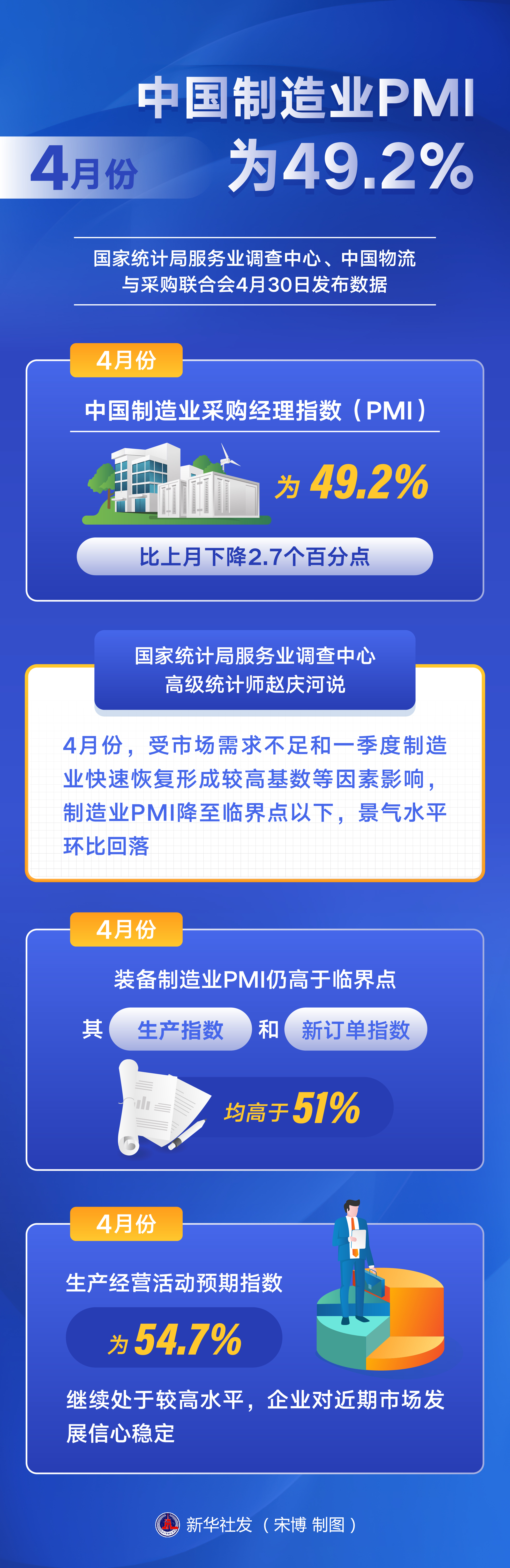 国家统计局服务业调查中心、中国物流与采购联合会4月30日发布数据,4月份,中国制造业采购经理指数(PMI)、非制造业商务活动指数和综合PMI产出指数分别为49.2%、56.4%和54.4%,虽低于上月2.7、1.8和2.6个百分点,但总体产出继续保持扩张,企业生产经营活动延续恢复发展态势。