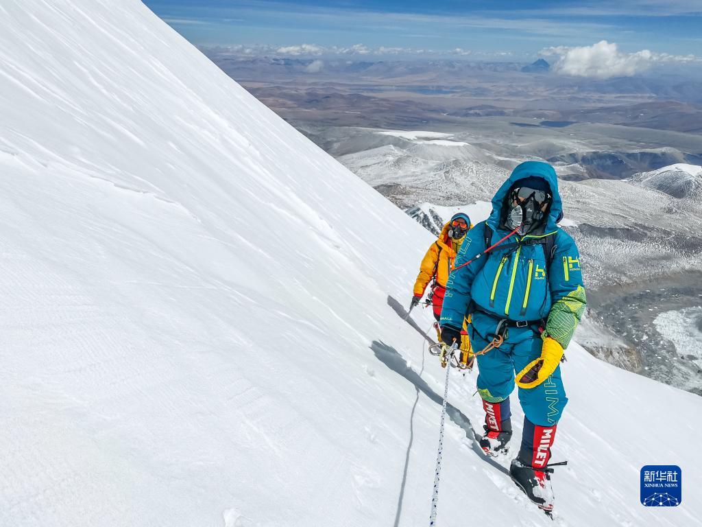 董红娟(左)在登顶希夏邦马峰后下撤(4月26日摄)。新华社发(顿巴 摄)