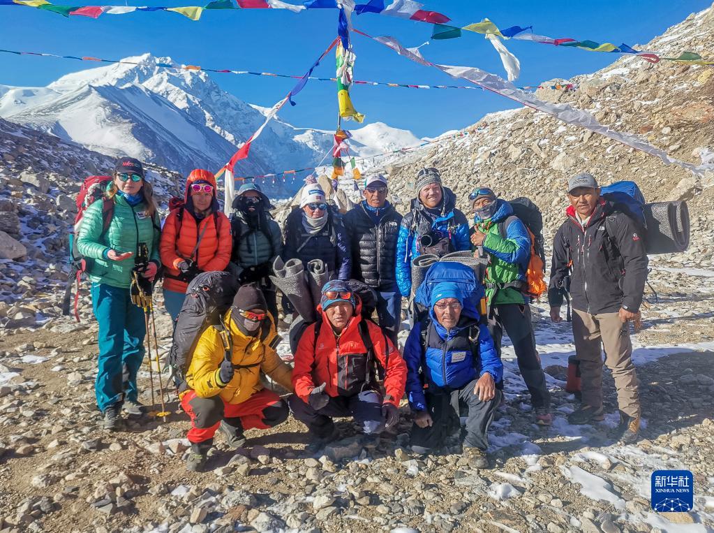 董红娟(后排左三)在开始攀登希夏邦马峰前与队友合影留念(4月23日摄)。新华社发(顿巴 摄)