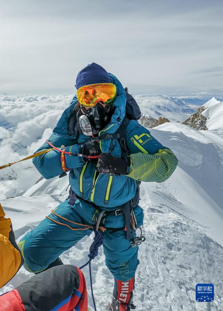 董红娟在海拔8027米的希夏邦马峰顶(4月26日摄)。新华社发(顿巴 摄)