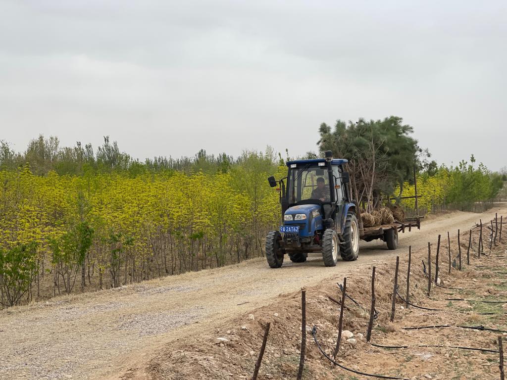 宁夏灵武白芨滩国家级自然保护区马鞍山林场内,一辆拖拉机在运送树苗。新华社记者苏醒 摄