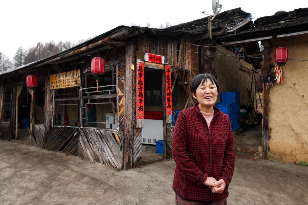 村民于艳霞在自家木屋前(2023年4月6日摄)。新华社记者许畅 摄