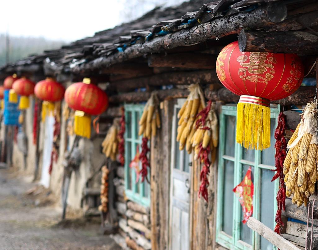 木屋外悬挂着灯笼和玉米、辣椒(2023年4月6日摄)。新华社记者许畅 摄