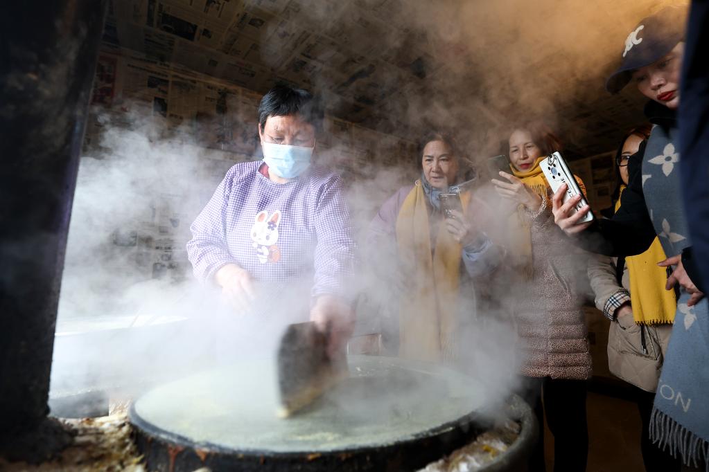 游客参观煎饼制作过程(2023年4月6日摄)。新华社记者许畅 摄