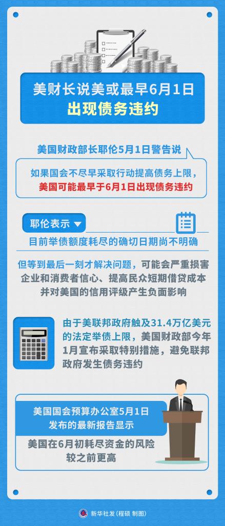 美国财政部长耶伦5月1日向美国国会发出警告:按照当前美国政府举债的速度,美国可能最早在6月1日触及现行法定债务上限,如果国会不抓紧通过立法提高债务上限,美国届时将再次陷入债务违约困境。