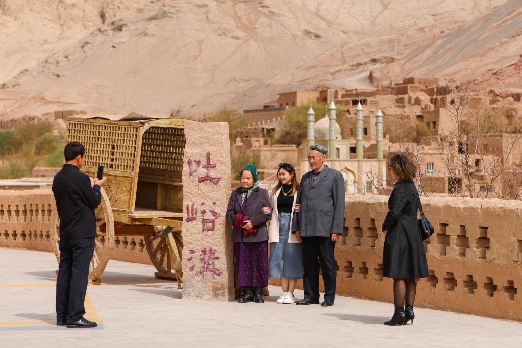 4月4日,游客在吐鲁番市鄯善县千年古村吐峪沟游玩。新华社记者刘红霞 摄