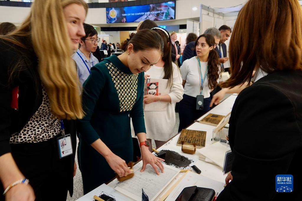 5月2日,在奥地利维也纳联合国城举行的2023年维也纳联合国中文日系列活动上,参访者体验中国传统拓印。新华社发(王宙 摄)
