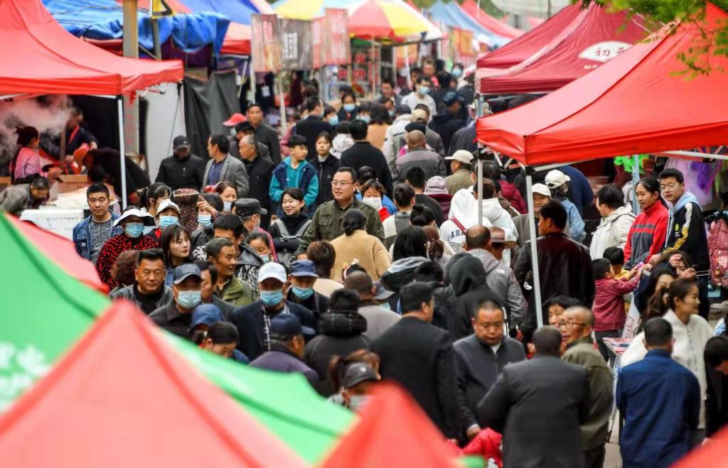 “五一”假期,孔子故里济宁曲阜市启动“黄河大集”春游季活动,文化味的大集在曲阜城乡各处“开花”,游客们体验文化,购买文创产品。