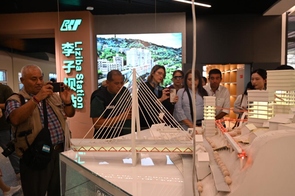 5月2日,在重庆市规划展览馆,洪都拉斯媒体代表团一行参观重庆立体交通模型。新华社记者 赵佳乐 摄
