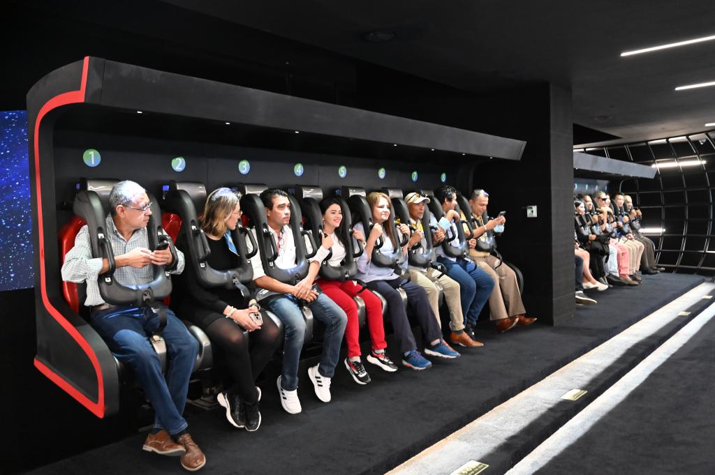 5月2日,洪都拉斯媒体代表团一行在重庆市规划展览馆体验“飞越重庆”飞行影院。新华社记者 赵佳乐 摄