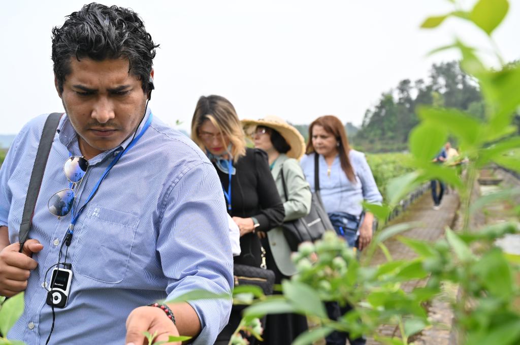 在南川区大观镇蓝莓产业示范基地,代表团成员观摩了先进的全基质种植技术。对于这片种植面积2000余亩、带动当地1000余名农民就近就业的项目,一名代表团成员有感而发:“洪都拉斯也是一个农产品生产大国,期待未来两国能够开展技术培训、技术援助方面的合作,将中国的种植经验、智能的种植系统传播到洪都拉斯,为当地民众带去致富的机遇,促进当地的生产和发展。”