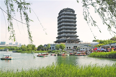 5月2日,游人在山东淄博齐盛湖泛舟游玩。“五一”小长假期间,人们来到各地景区游玩,乐享假期。 新华社发(张进刚 摄)