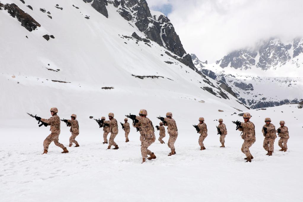 西藏军区某边防团标沙拉错哨点官兵巡逻途中互帮互助(2023年4月22日摄)。叶元林 摄