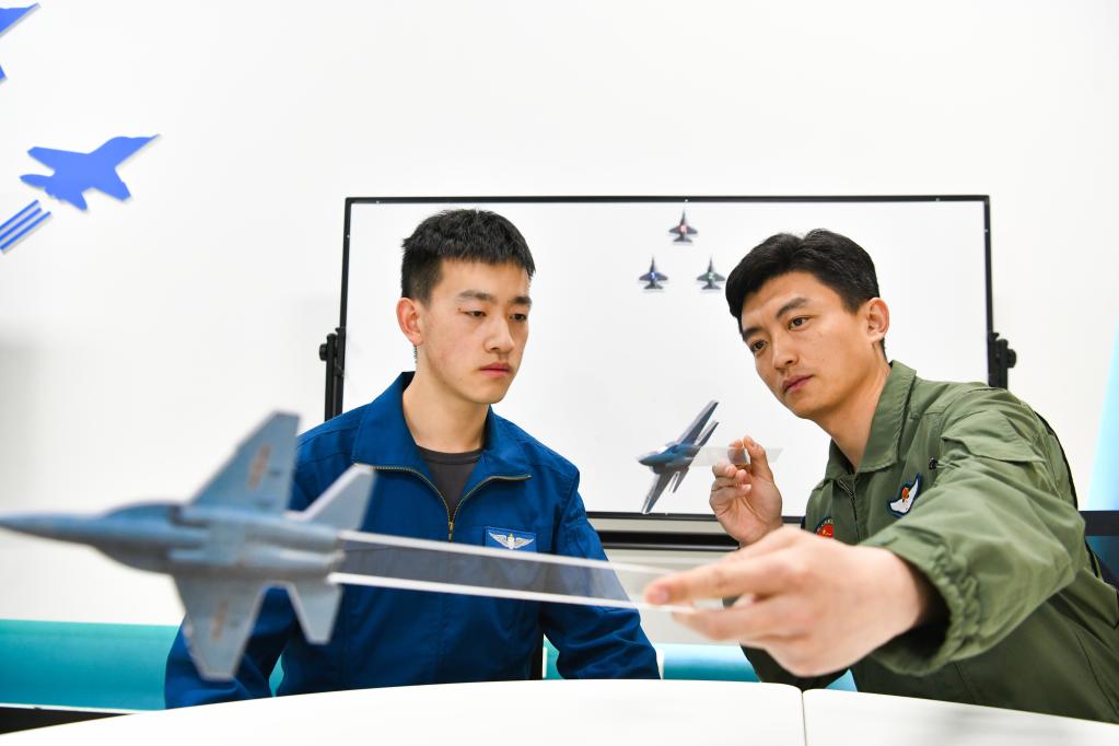空军石家庄飞行学院某旅飞行教员与“清北班”学员进行一对一协同准备(2023年4月24日摄)。朱桦 摄