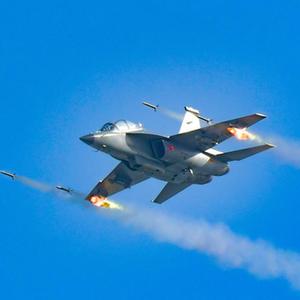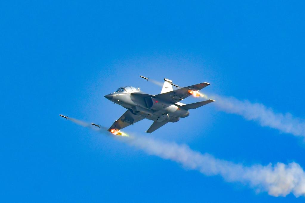 空军“清北班”飞行学员驾驶教-10飞机在华北某靶场上空发射火箭弹(2023年4月16日摄)。李敏 摄