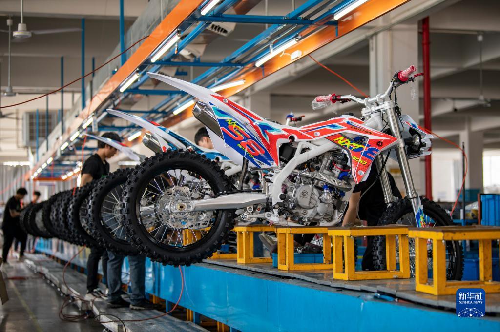 5月4日,在浙江省金华市武义县桐琴镇五金工业区的一家企业,工人赶制准备销往海外的越野摩托车。