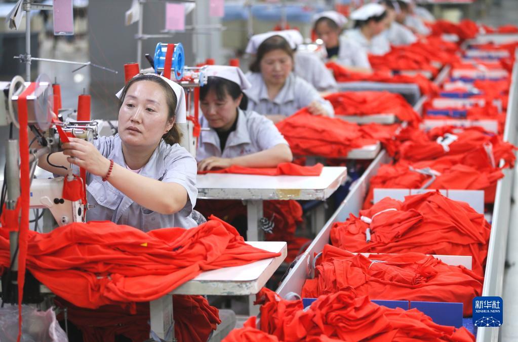5月4日,在山东省青岛市即墨区一家服装企业,工人生产出口到海外市场的服装。