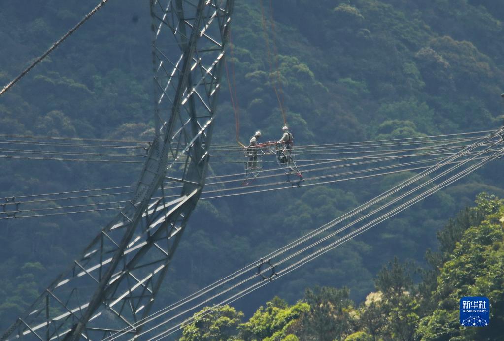 5月4日,在福建省宁德市洪口乡,国网福建超高压公司带电班检修工周晓刚(右)对输电线路进行带电作业。