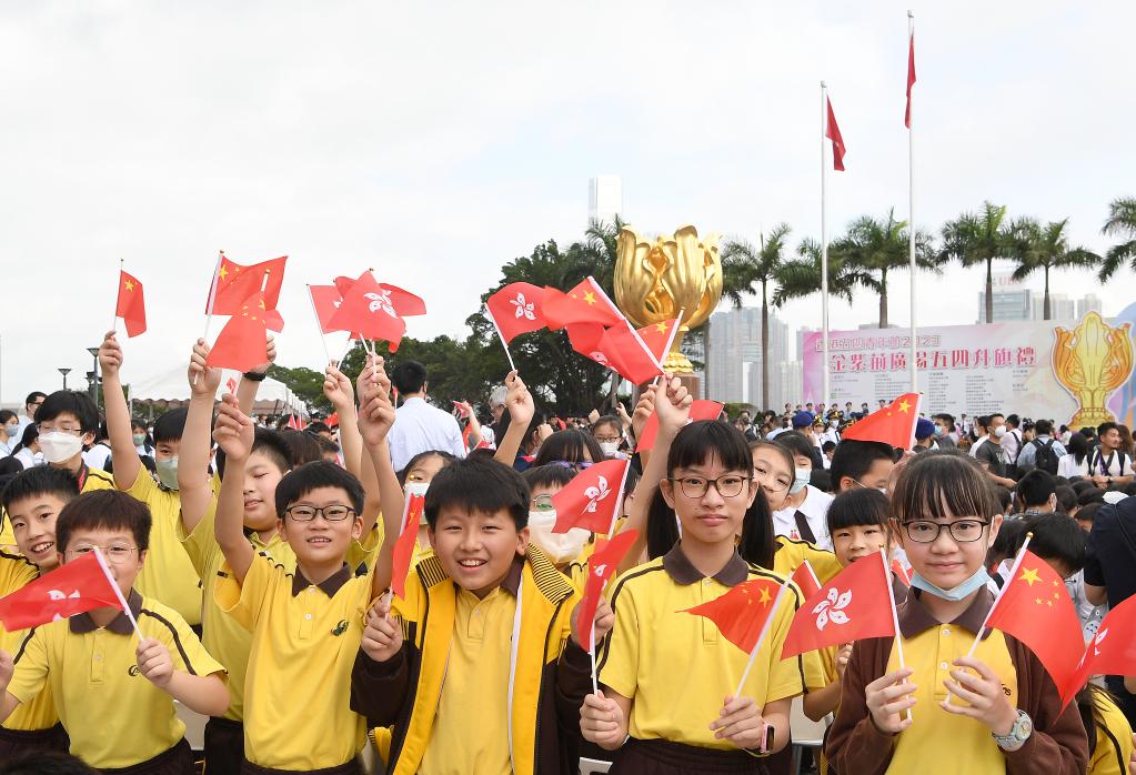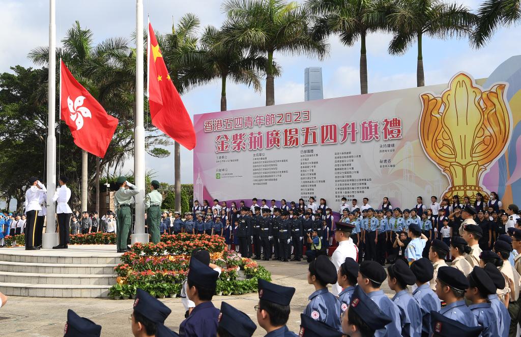5月4日,香港各界青少年活动委员会在金紫荆广场举行“五四升旗礼”。新华社记者 陈铎 摄