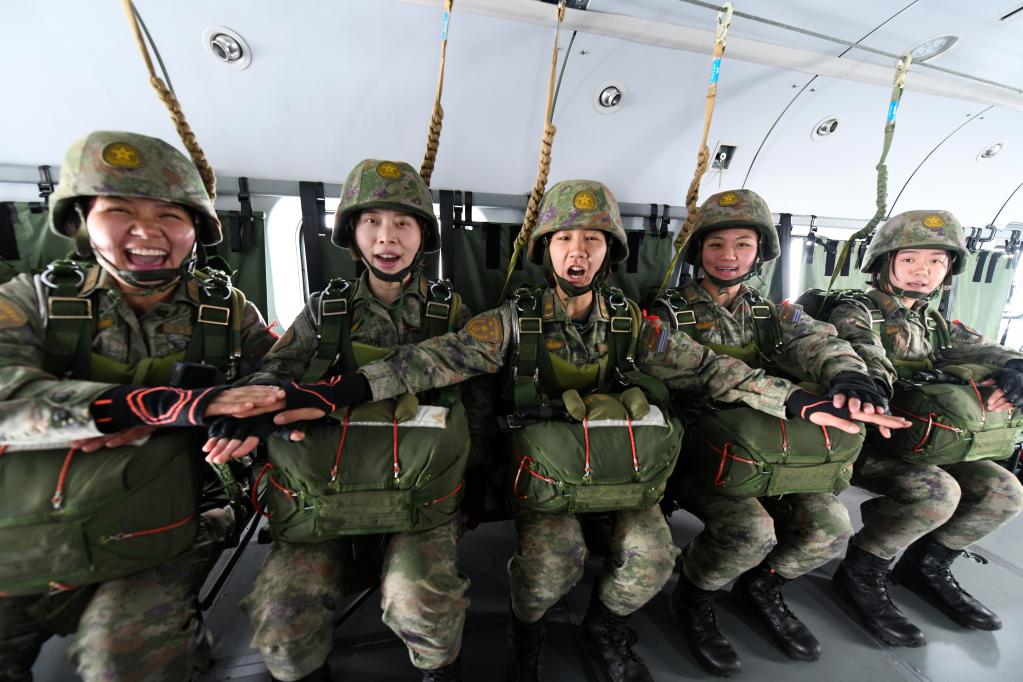 海军陆战队某旅女兵分队参加伞降实跳训练(2023年4月20日摄)。宋紫栋 摄