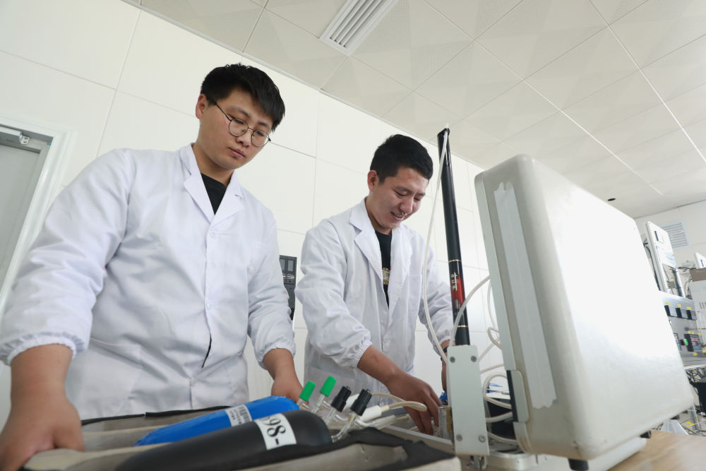4月6日,瓦里关本底站观测员时闻(左)和杨昊(右)在开展气瓶采样。新华社记者 王艳 摄