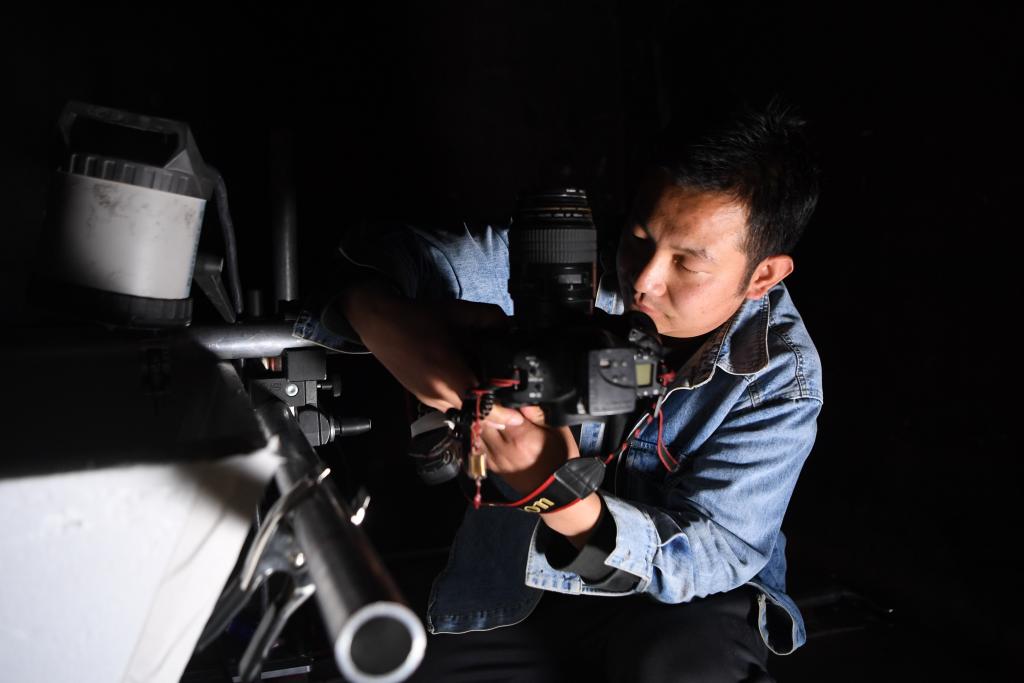 敦煌研究院文物数字化保护团队图像采集人员何文江在洞窟内进行壁画图像采集(4月25日摄)。新华社记者 方欣 摄