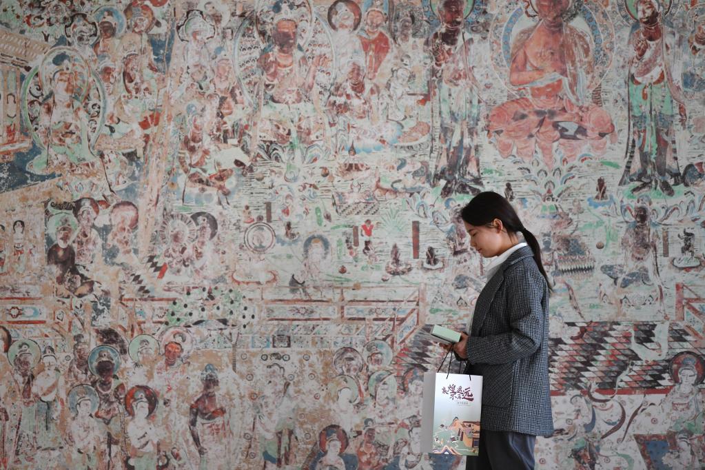 敦煌研究院文物数字化保护团队创意营销人员廖雪婷从一幅高保真复制壁画前走过(4月25日摄)。新华社记者 陈斌 摄
