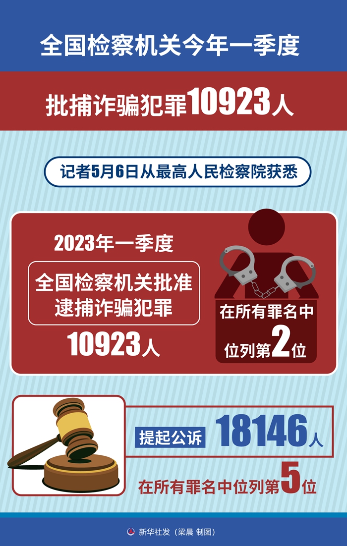 新华社北京5月6日电(记者冯家顺、刘奕湛)记者6日从最高人民检察院获悉,2023年一季度全国检察机关批准逮捕诈骗犯罪10923人,在所有罪名中位列第2位;提起公诉18146人,在所有罪名中位列第5位。