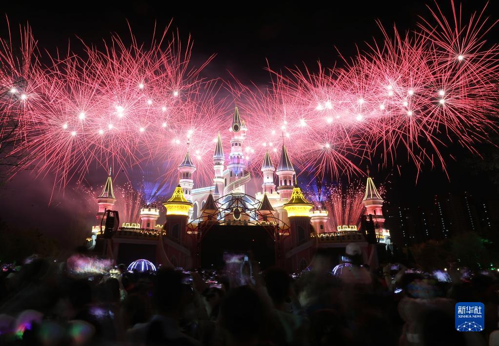 5月1日,游客在沈阳方特欢乐世界观赏烟花表演。