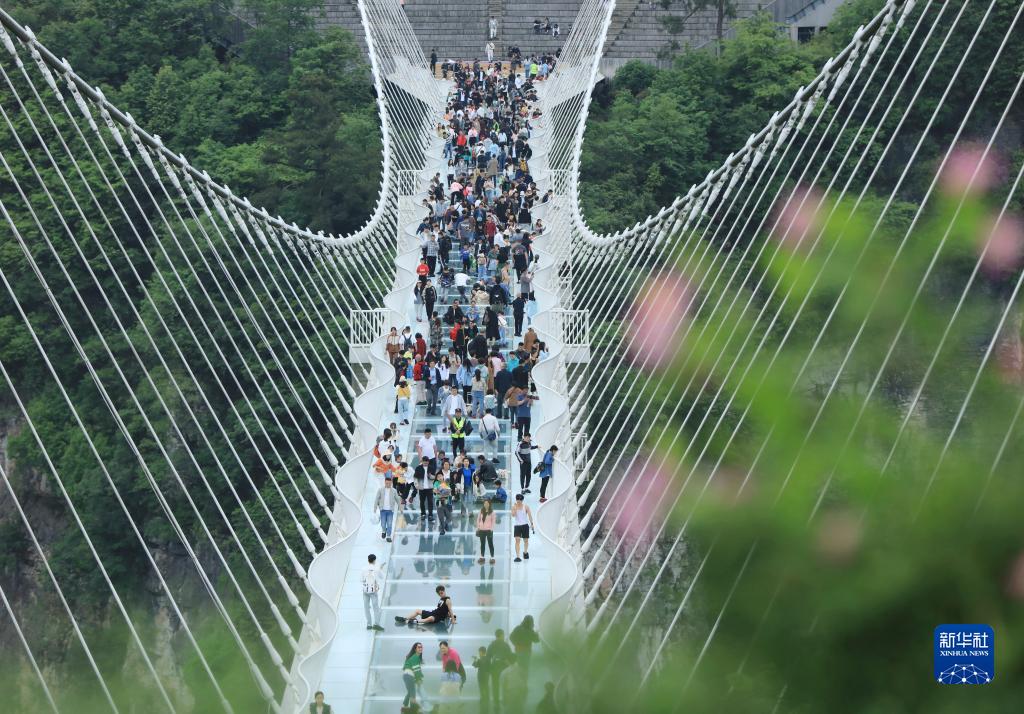 5月2日,游人在湖南张家界大峡谷风景区体验高空玻璃桥。