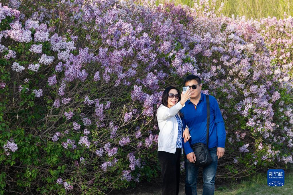 5月6日,游客在哈尔滨丁香公园赏花拍照。
