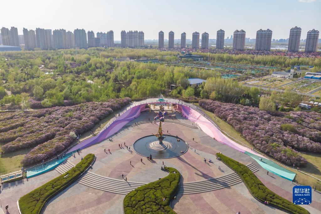 5月6日,游客在哈尔滨丁香公园赏花游玩(无人机照片)。