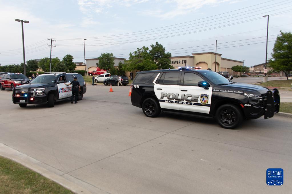 5月6日,警车停在美国得克萨斯州达拉斯近郊发生枪击事件的购物中心附近。新华社发(田丹摄)
