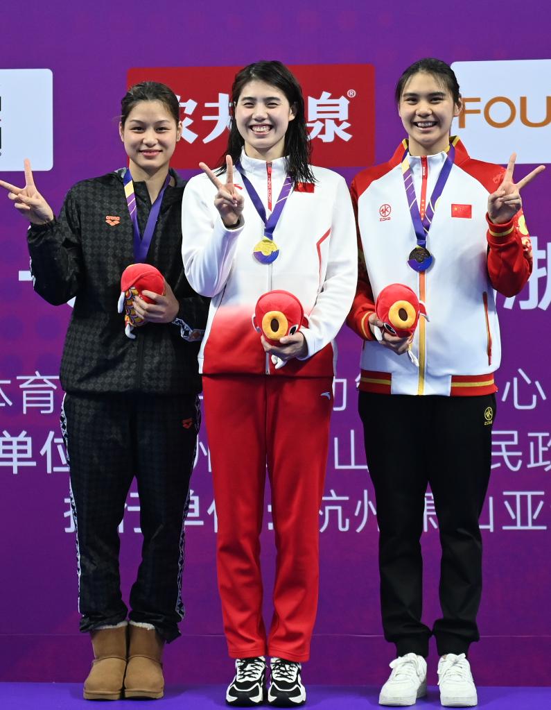 5月2日,男子100米蛙泳冠军覃海洋(中)、亚军闫子贝(左)和季军孙佳俊在颁奖仪式上。