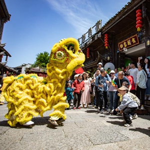 4月30日,游客在重庆市秀山土家族苗族自治县洪安镇老街观看舞狮表演。(胡程 摄)