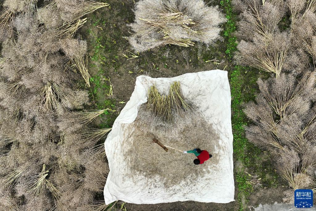 5月8日,重庆市黔江区中塘镇胜利村村民在进行油菜脱籽(无人机照片)。
