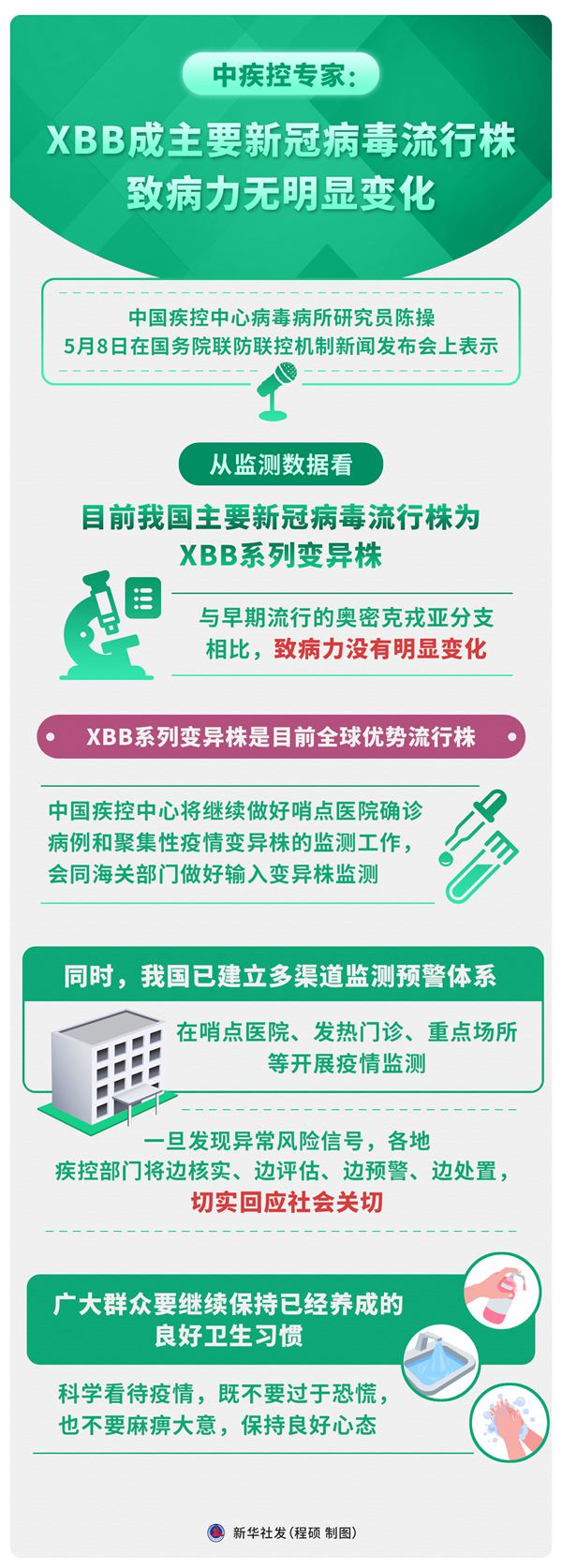 新华社北京5月8日电(记者李恒、顾天成)中国疾控中心病毒病所研究员陈操8日在国务院联防联控机制新闻发布会上表示,从监测数据看,目前我国主要新冠病毒流行株为XBB系列变异株,与早期流行的奥密克戎亚分支相比,致病力没有明显变化。