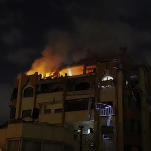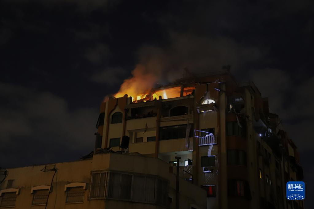 这是5月9日在加沙城拍摄的遭到空袭后失火的建筑。新华社发(里泽克·阿卜杜勒贾瓦德摄)